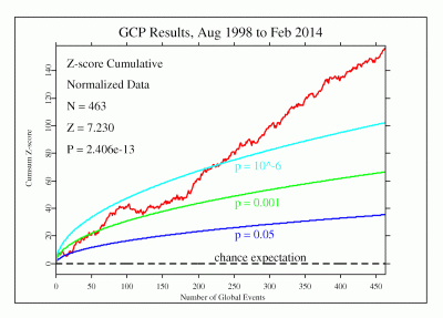 Der Faktor p steht für die Wahrscheinlichkeit, dass ein bestimmtes Ereignis seine Wirkungen zufällig erzeugt. Es ist ein ziemlich gutes Mass einer globalen Abstimmung(Kohärenz) des Bewusstseins auf der Oberfläche des Planeten. Je niedriger die Zahl, desto mächtiger ist die Kohärenz des Bewusstseins.