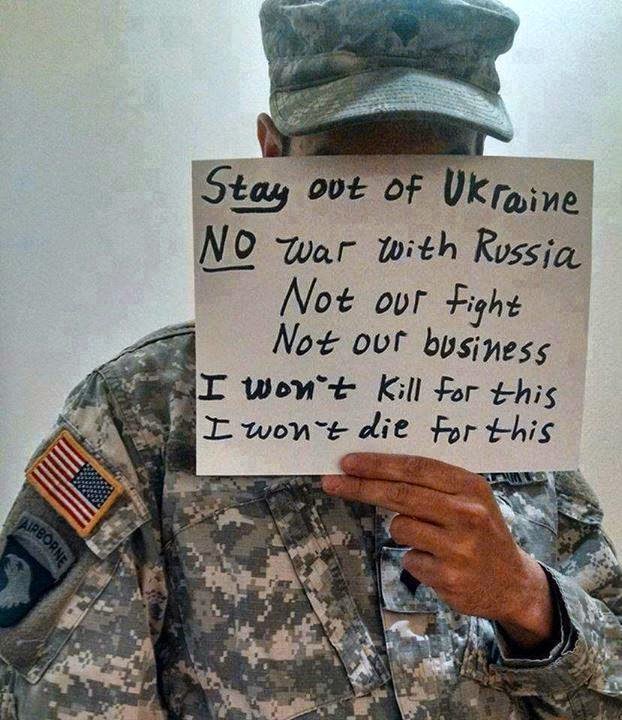 Als letzten Herbst die Kriegshetze gegen Syrien losging, auf Grund der Lüge über einen Giftgaseinsatz von Assads Truppen, und ein Angriff unmittelbar bevorstand, haben Mitglieder des US-Militärs eine Widerstandskampagne gegen den Krieg gestartet. Soldaten in Uniform hielten Plakate vors Gesicht mit der Botschaft, sie würden nicht in Syrien kämpfen, damit die Terroristen der Al-Kaida die Macht in Damaskus übernehmen. Jetzt hat die gleiche Aktion begonnen, in dem der erste Soldat klarstellt, er will keinen Krieg mit Russland, will nicht dafür töten und nicht dafür sterben.