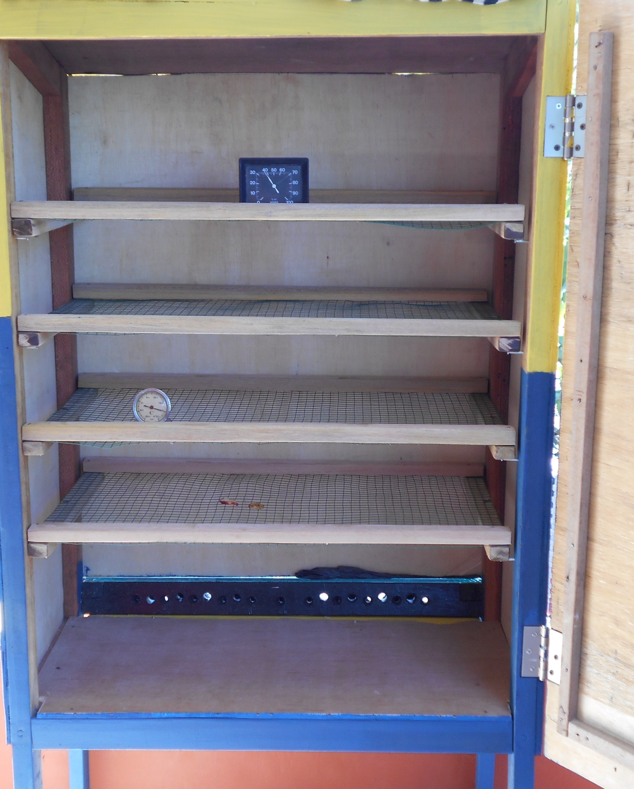 Dann noch ein solides Holz – L als Schliesser angebracht…und Bananenscheiben und Moringablüten suhlen in Trockenheit.