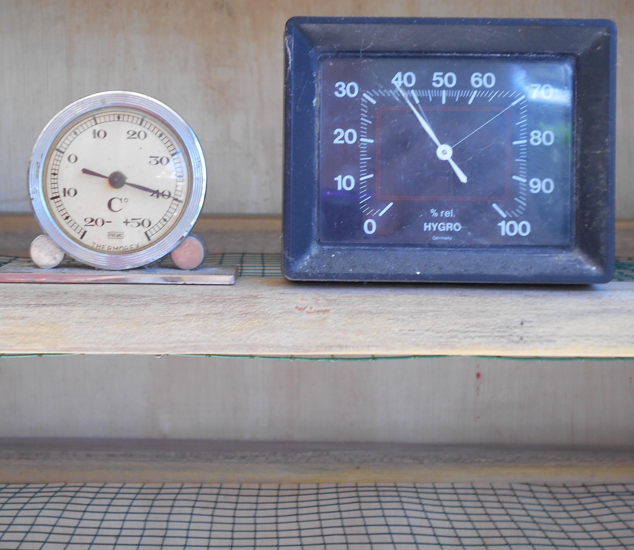 Die Temperatur am Schatten, konstant wie immer um die 28 Grad (nebenbei: der hier zu bestaunende Thermometer ist zwischen 70 und 80 Jahre alt), die Luftfeuchtigkeit, wie meistens, um die 70 Volumenprozent.
