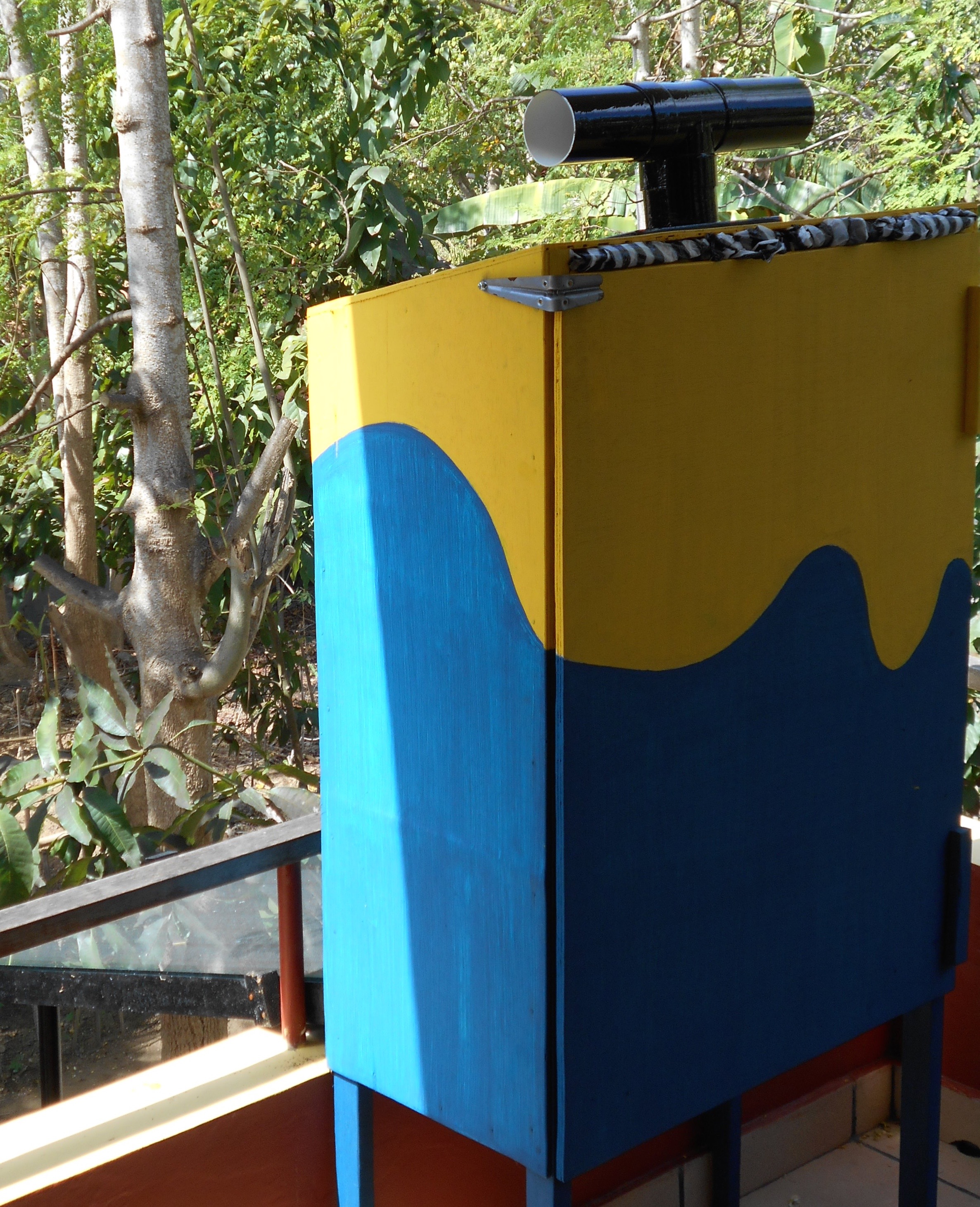 Links das Solarpaneel. Unten Sperrholz, daraufgelegt Welldach aus natürlichem Material zwecks Zweistrombetrieb, zugedeckt mit einer Glasscheibe. Das Ganze geneigt, auf dass die erwärmete Luft mittels Thermik nach oben steigen möge, unten und oben ( im Bild nicht sichtbar, links und rechts) natürlich Löchli in den umrahmenden Latten. Das Paneel steckt sein oberes Ende sinnreicherweise in den Popo der Kiste. Oben am Rand der Foto, kaum definierbar über der Türe der Luftaustritt.