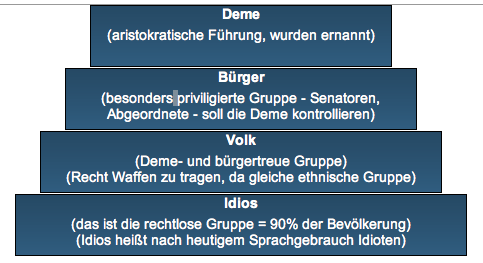 So weit weg vom klassischen Modell der griechischen Demokratie sind wir nämlich gar nicht: Bei uns herrschen „Funktionäre“ (die “Demen”) mittels „Bürger“ (“Abgeordnete”) und dem „Volk“ (Polizei, Staatsschutz, Geheimdienste, Militär) über den Rest der Bevölkerung (also Du und ich, die Idios, d.h. Sklaven).