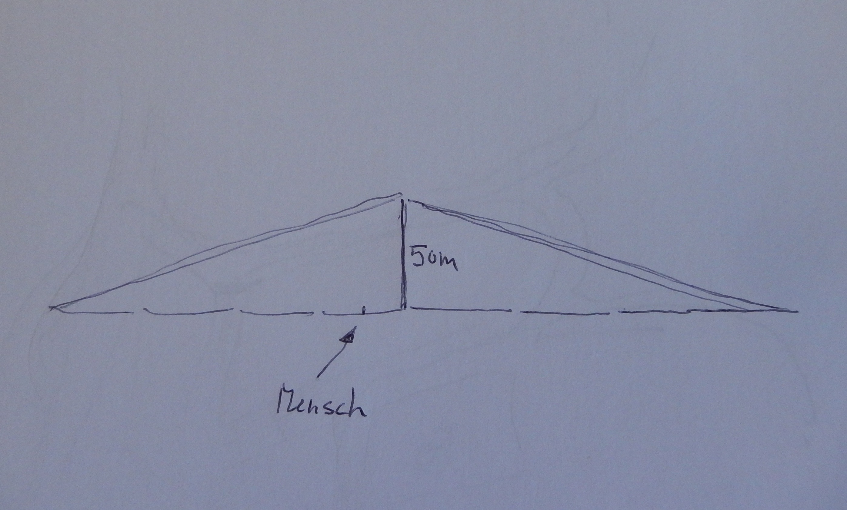 Schuttkegel also: Höhe 50 Meter, Durchmesser der Grundfläche 200 Meter.