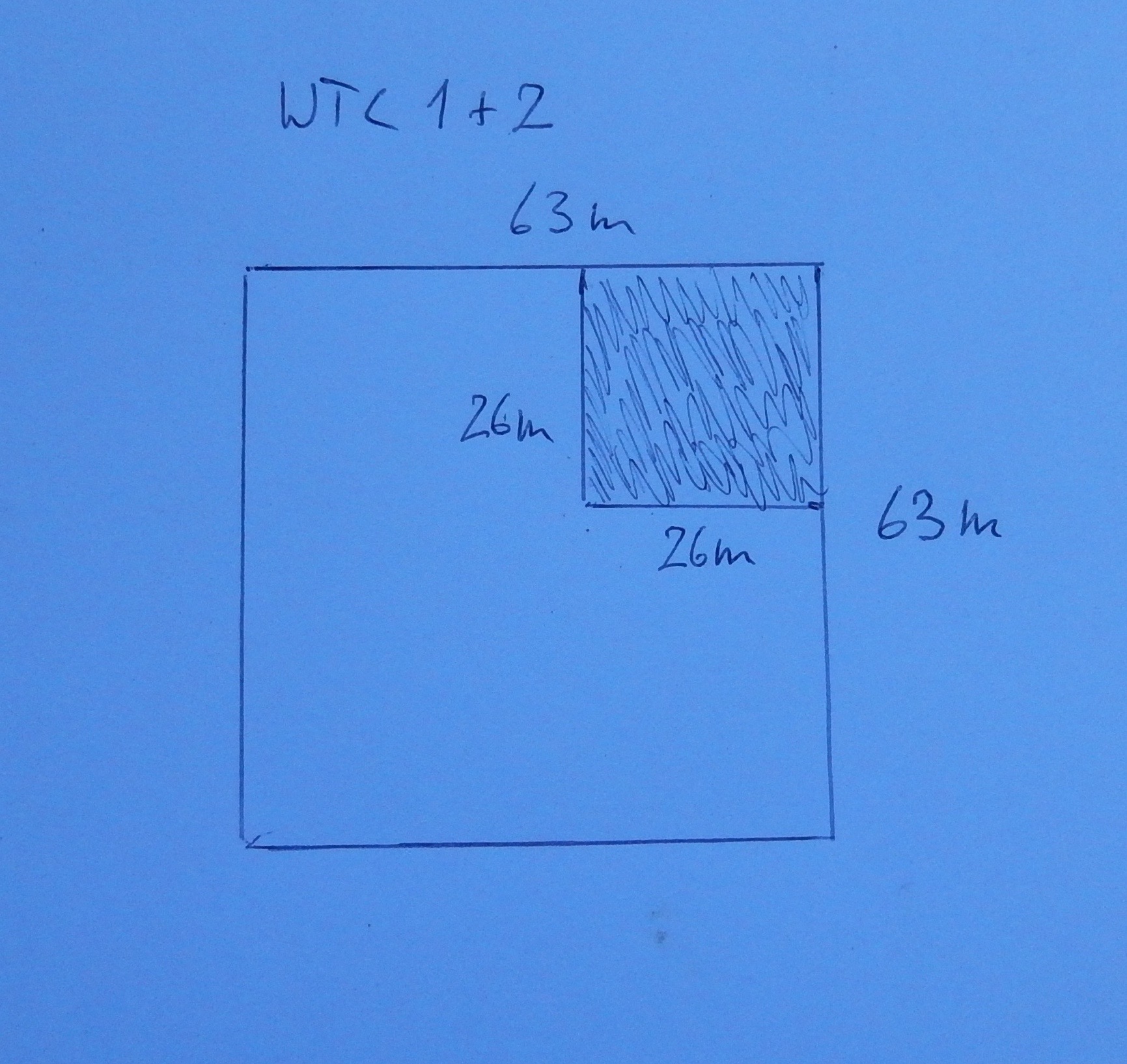 Ich nehme mal an, dass die von mir berechneten 300’000m3 Trümmer auf die Länge des Turmes gedehnt und als Quader geformt seien. Die Türme massen 417 Meter.