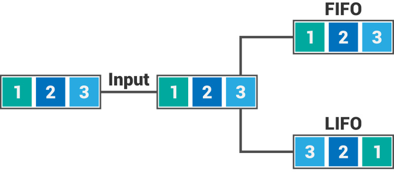 Hier ist es angebracht und erbeten, in den Text einen Vergleich mit den beiden Arbeitssystemen mit Zahlendaten oder Lagervorräten anzubringen – FIFO (first in, first out) oder LIFO (last in, first out), was ins Deutsche übersetzt „zuerst rein, zuerst raus“ und „zuletzt rein, zuerst raus“ bedeutet.