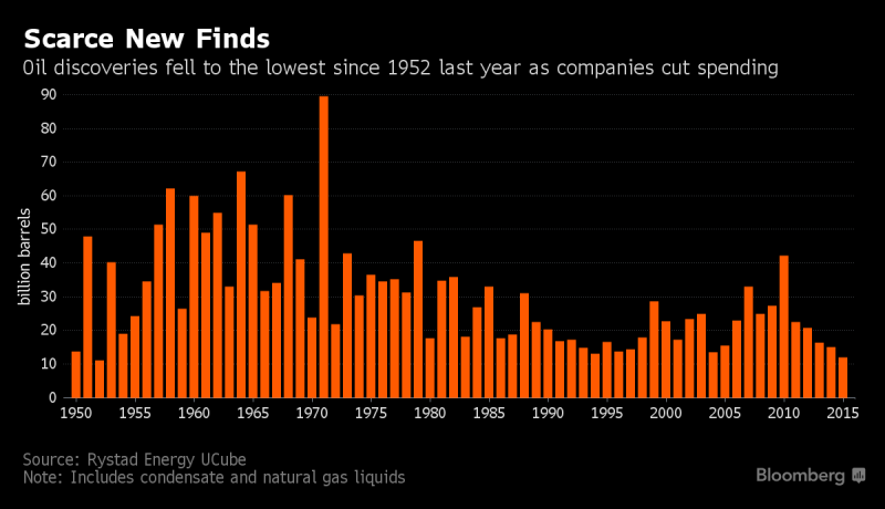 Im Jahre 2015 wurden auf der ganzen Welt nur 2,8 Mrd. Barrel neuer Erdölvorräte gefunden. Das ist ein historisches Minimum der letzten 60 Jahre, so wenig wurde seit 1954 nie gefunden. Über die Gründe dafür habe ich schon geschrieben – sogar der Investitionsregen der Jahre 2000 – 2010 und die Höchstpreise für Erdöl hatten die Branche nur am Leben erhalten, und der Absturz der Erdölpreise in den Jahren 2015 – 2016 und der Investitionsstop führte sofort zum Zusammenbruch der gesamten Erkundung und der neuen Investitionen in die Förderung.