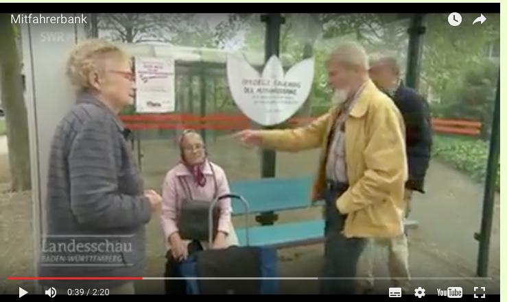 Die Mitfahrerbank als kluge oekologische Einrichtung mit dem schönen Nebeneffekt, dass sich Menschen begegnen.