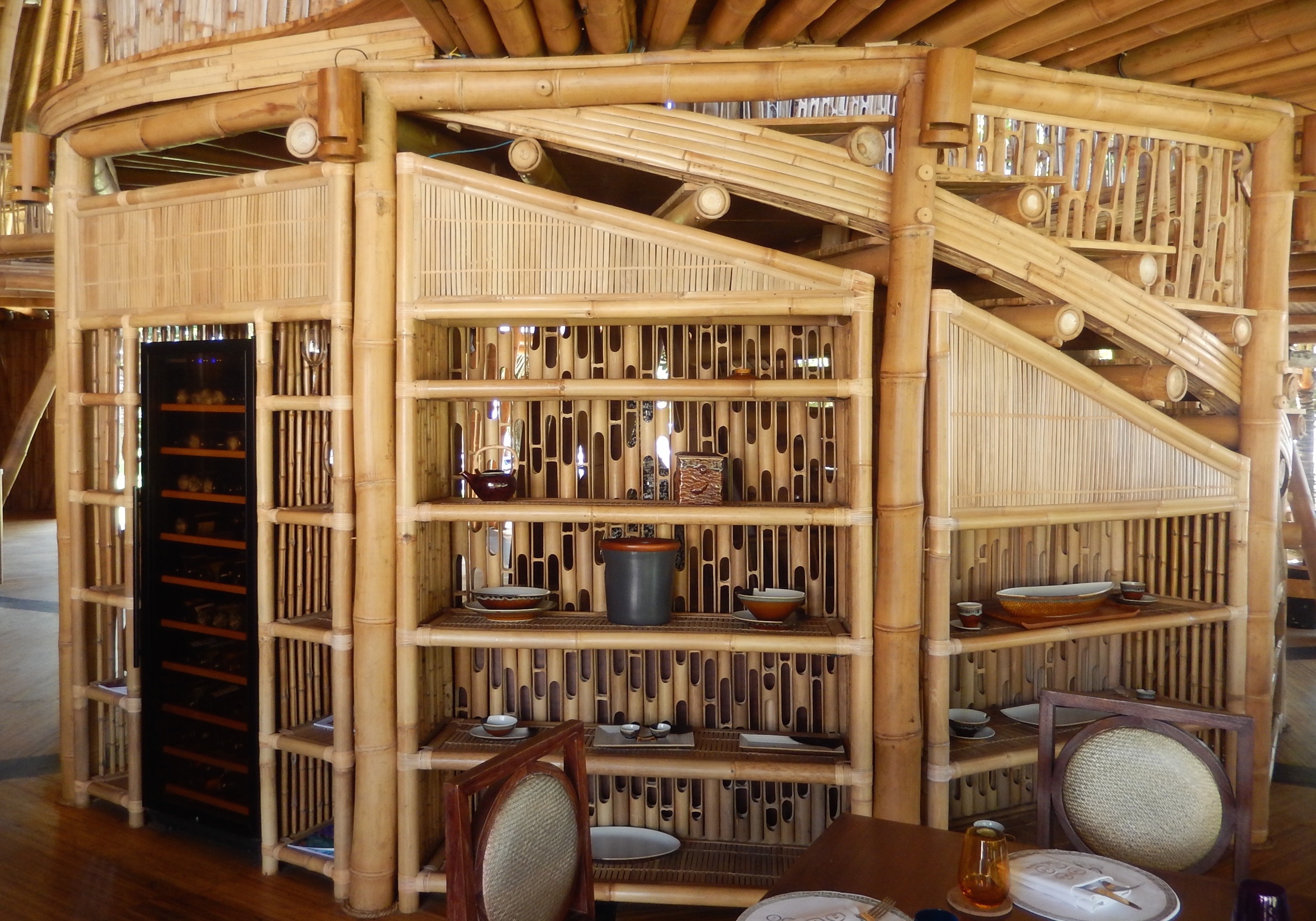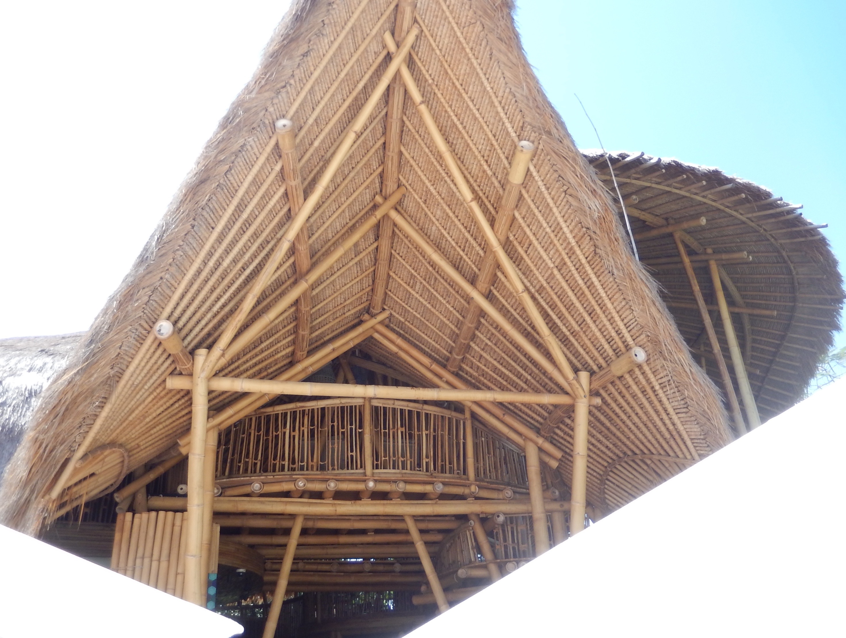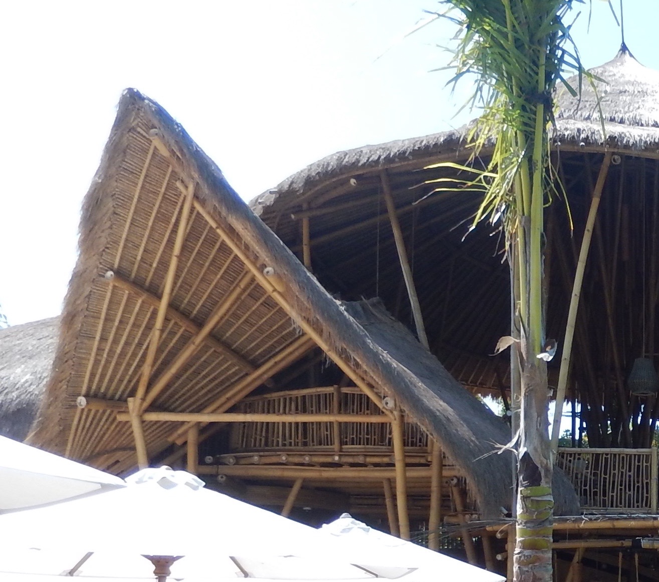 Mir will scheinen, dass die Konstruktores dieses Restaurants eine Kombination von Westtechnik und Tradition gemacht haben. Traditionell dürfte die Anordnung der Bambuselemente sein. Die Verbindungen aber, haha, die sind – wenn man so will – Betrug. Mir will scheinen, dass sie zum Teil Metallbolzen verwendet haben. So viel ich weiss, verwendet man traditionell auch Naturmaterial als Befestigungs-„Schnur“, umwickelt kunstvoll, statisch geometrisch handwerklich gekonnt.