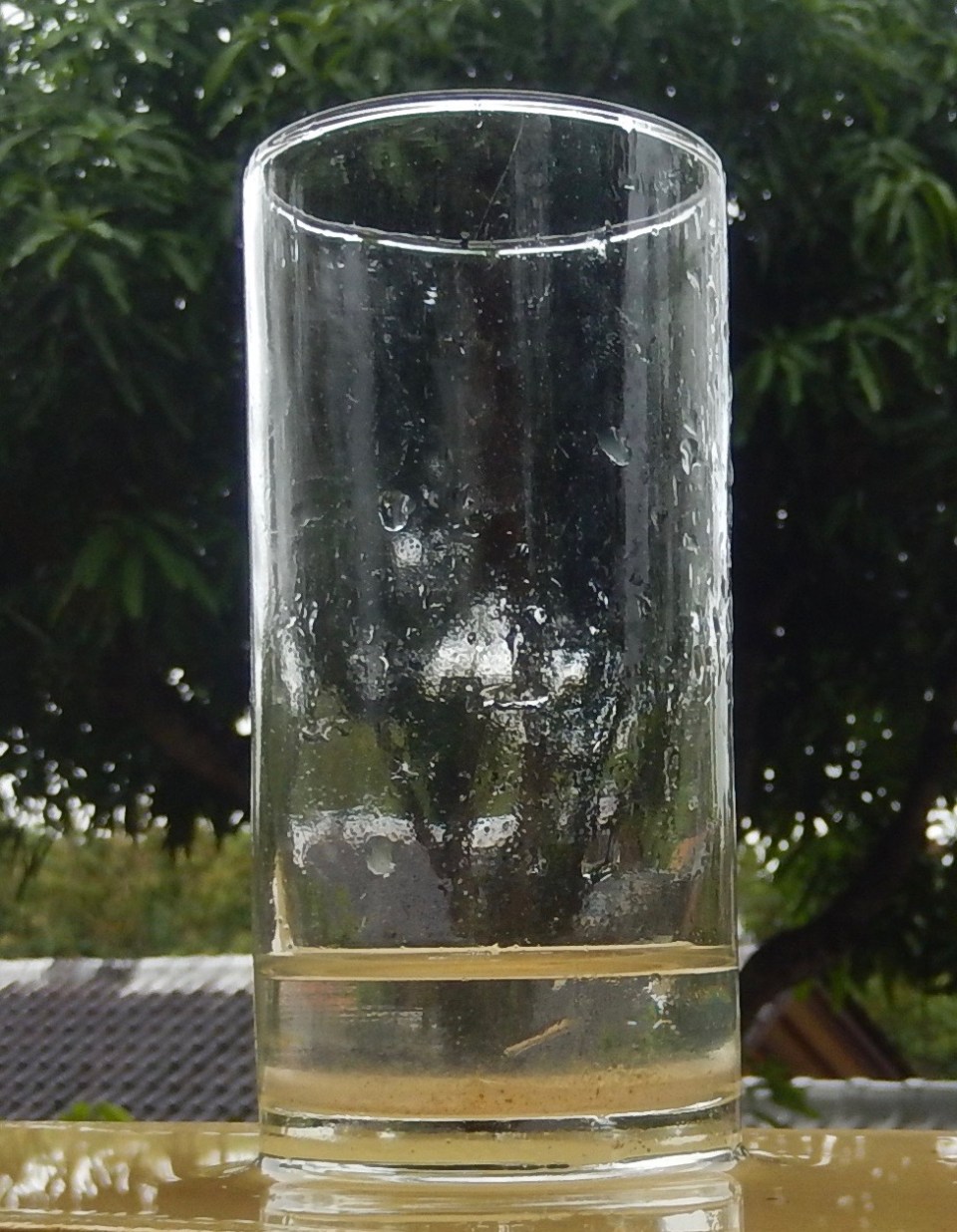 Diese Fotografie hat er vor ein paar Minuten gemacht. Es ist Bossis Regenmesser. Heute Morgen war das Glas fast voll, und seither sind weitere zwei Centimeter gefallen. Da sind also während der letzten zehn Stunden 14 Centimeter Regen heruntergeprasselt. Wir wohnen gut, es kann bei uns keine Ueberschwemmung geben.