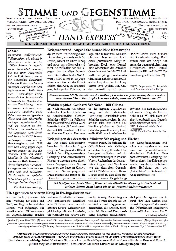S+G bringt Themenkreise in konzentrierte Form, meines Erachtens sorgfältig erarbeitet, in der hier hineinkopierten Ausgabe brisante Hintergründe des Jugoslawienkrieges. Ich empfehle dir, S+G mal anzuschauen.