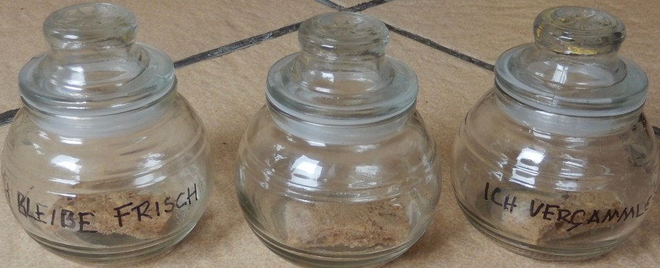 Ich mache neu ein Experiment mit drei Stückchen Vollkornbrot. Ich nehme drei exakt gleich grosse Stückchen, gebe sie in drei luftdicht verschlossene Gläser und beschrifte sie: