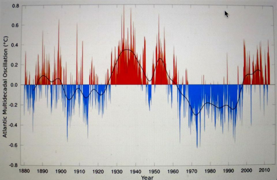 This is known as the Atlantic Multidecadal Oscillation (AMO), and the transition between its positive and negative phases can be very rapid. For example, Atlantic temperatures declined by 0.1C per decade from the 1940s to the 1970s. By comparison, global surface warming is estimated (!) at 0.5C (?) per century – a rate twice as slow.!