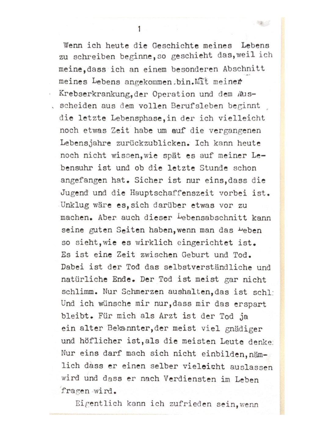 Geboren bin ich im Ersten Weltkrieg, und den Zweiten habe ich als erwachsener Mann und Soldat mitgemacht. Als ich geboren wurde, regierte noch Kaiser Wilhelm‚ meine Kindheit und frühe Schulzeit fällt in die Weimarer Republik. Die Jugend wurde durch das Dritte Reich und den 2. Weltkrieg geprägt, und dann habe ich meine Ehe und Berufsjahre in der DDR zugebracht. Manchmal habe ich Pech gehabt, aber viel öfter Glück. Von meinem Geburtsjahrgang sind die meisten Männer im Kriege gefallen und nun schon über 30 Jahre tot, und über die Gräber der meisten geht heute der Pflug.
