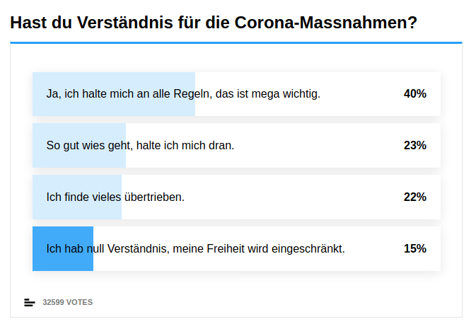 Startseite » Maskenwichtigkeit / Umfrage-Ergebnis in der Schweiz » Corona Statistik Umfrage Schweiz 20 Minuten