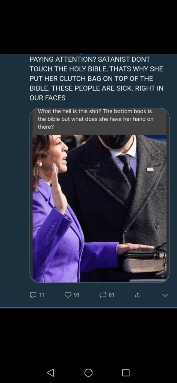 Es geht aber weiter: beim Ansehen des Geschehens ist mir aufgefallen, dass die ‚gewählte‘ Vizepräsidentin Kamela Harris VOR Joe Biden vereidigt worden ist und ich habe ich gewundert. Dies ist gemäss der Verfassung nicht zulässig – zuerst müsste der neue Präsident seinen Eid ablegen. Was ich nicht gesehen habe, aber von sehr aufmerksamen Zuschauern registriert worden ist: bevor Kamela Harris ihre linke Hand auf die Bibel gelegt hat, ist dort eine Mappe platziert worden, ist sie evtl. eine Satanistin?
