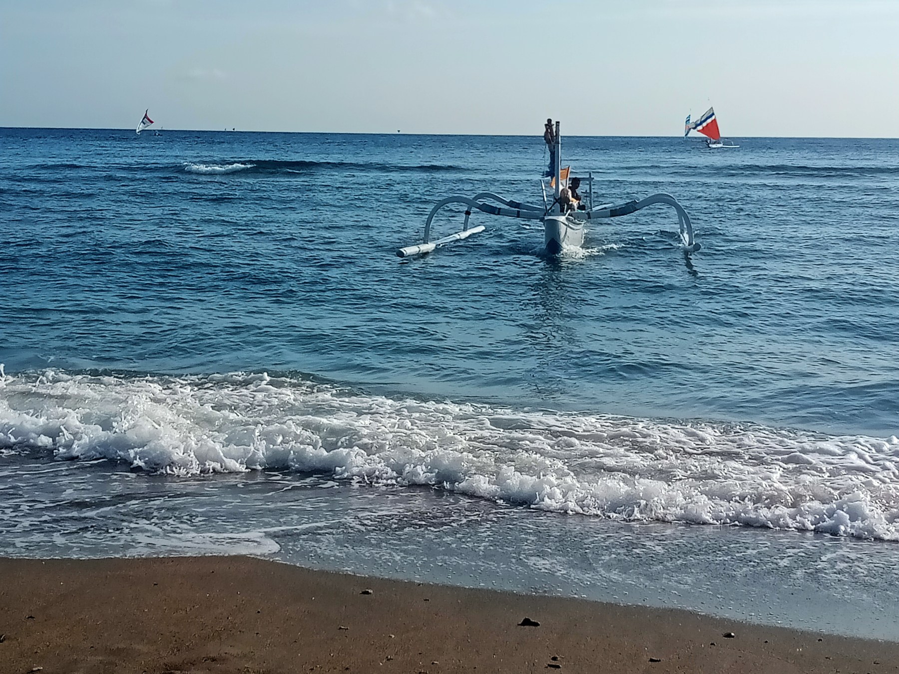 Wenn ablandiger Wind…..was ist, wenn der Motor ausfällt? Gottvertrauen ist alles. Lächel. Sind da noch Paddel. Muskelkraft…