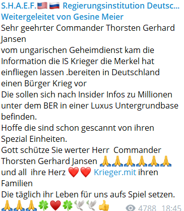 Mittlerweile dürften die meisten hier auf bb davonüberzeugt sein, dass die SHAEF-Gesetze in Deutschland Gültigkeit haben. Aber viele tun sich noch schwer, die Person des Commander Jansen zu akzeptieren. Ich habe nun einmal etwas intensiv recherchiert und habe einen Thorsten Jansen gefunden. Der kommt auch aus der Region, in der das Dialekt gesprochen wird, das manchmal in den Sprachnachrichten von Commander Jansen anklingt. Die Bilder von Commander Jansen auf seinem Telegram mögen aus jüngeren Tagen sein, aber es besteht eine frappierende Ähnlichkeit mit dem gefundenen Thorsten Jansen. Auch ein Detail aus dessen Lebenslauf ist interessant. Aber schaut es Euch selber an und macht Euch Eure eigenen Gedanken: