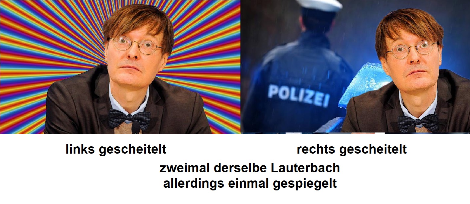 Ob links, rechts oder mittelgescheitelt, ob mit maroden Zähnen oder mit reparieren Solchen…..mein „zwischen-den-Info-Bildern“-Lesen sagt mir, dass es einen original Lauterbach schon lange nicht mehr in der Öffentlichkeit gibt, selbstverständlich kann ich das mit Nix belegen.