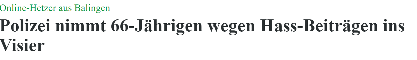 „Wegen Hass-Beiträgen im Internet hat es in dieser Woche im Rahmen eines bundesweiten Aktionstags Verhaftungen und Wohnungsdurchsuchungen gegeben. Auch ein Balinger, den die Behörden schon länger im Visier haben, erhielt Besuch von den Ermittlern.“