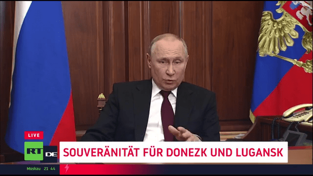 Erst ganz am Ende der Rede teilt Putin, fast schon nebenbei, mit, dass er die Donbass-Republiken nun anerkennt und mit ihnen Verträge über Zusammenarbeit und Schutz abschließen wird. Er beendet die Rede mit einer deutlichen Warnung an Kiew, die Feindseligkeiten sofort einzustellen, oder selbst die für die Folgen weiterer Feindseligkeiten die Verantwortung zu übernehmen.