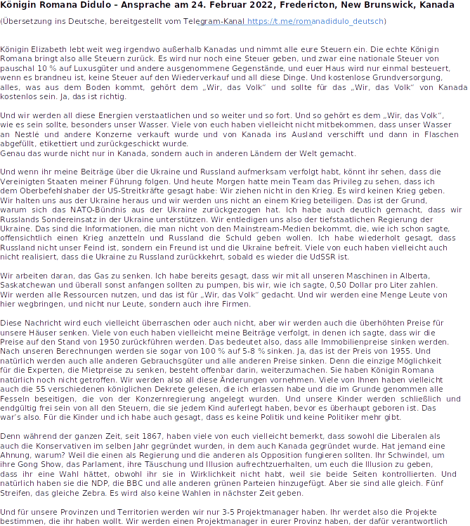 Startseite » AUTOREN » ADMIN THOM RAM » 20220224 / Queen Romana Didulo / Ansprache in New Brunswick