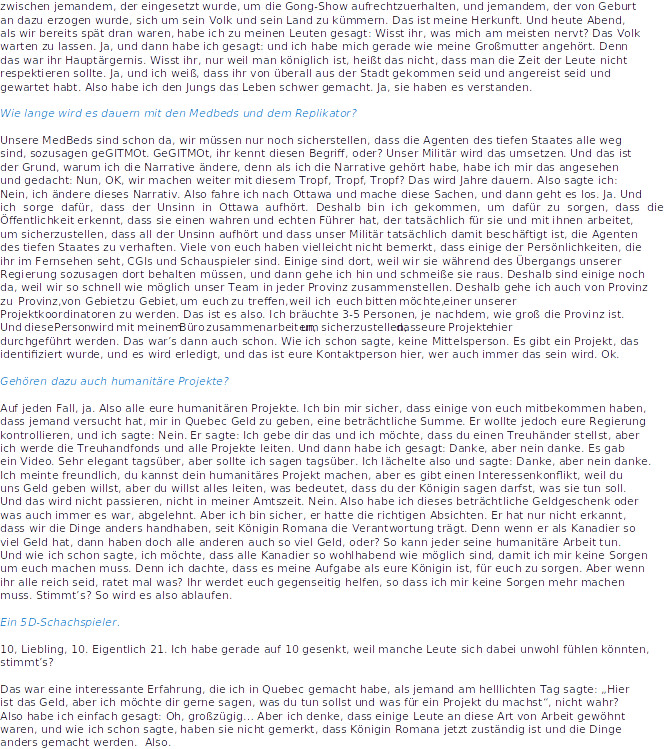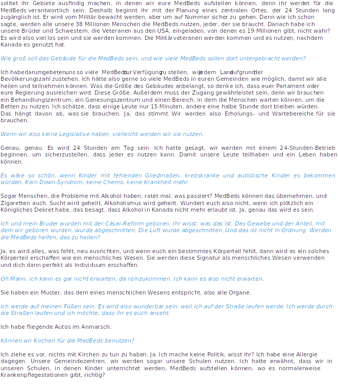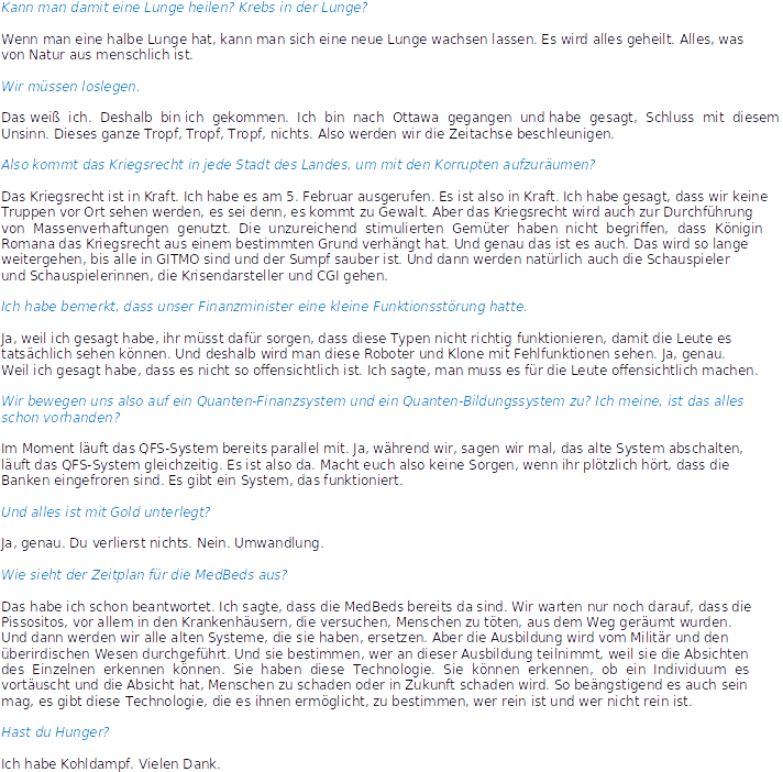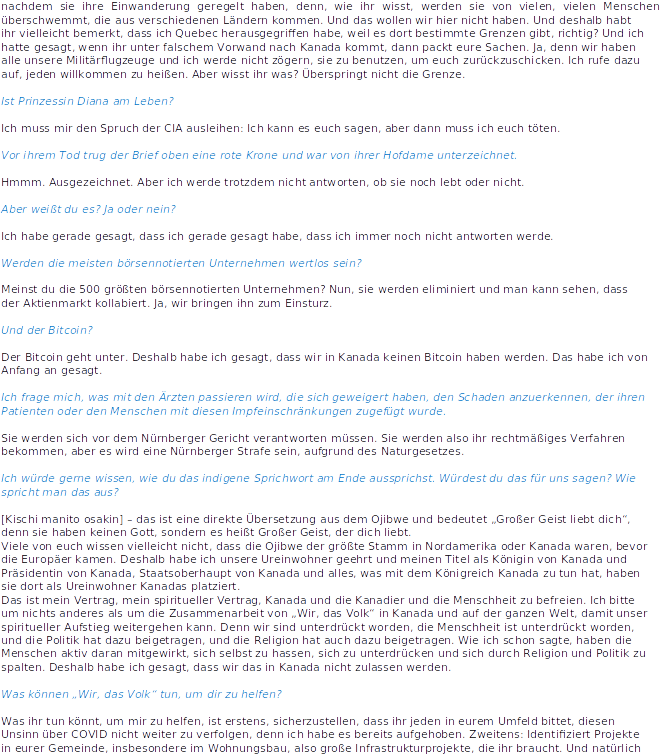 Schlagwörter: ansprache, aufräumen, bumi bahagia, Canada, Fragen und Antworten, Freiheit, interview, kanada, Medbed, militär, Naturrecht, Pissositos, Queen Romana Didulo, Rede, regierung, USA, Verwaltung