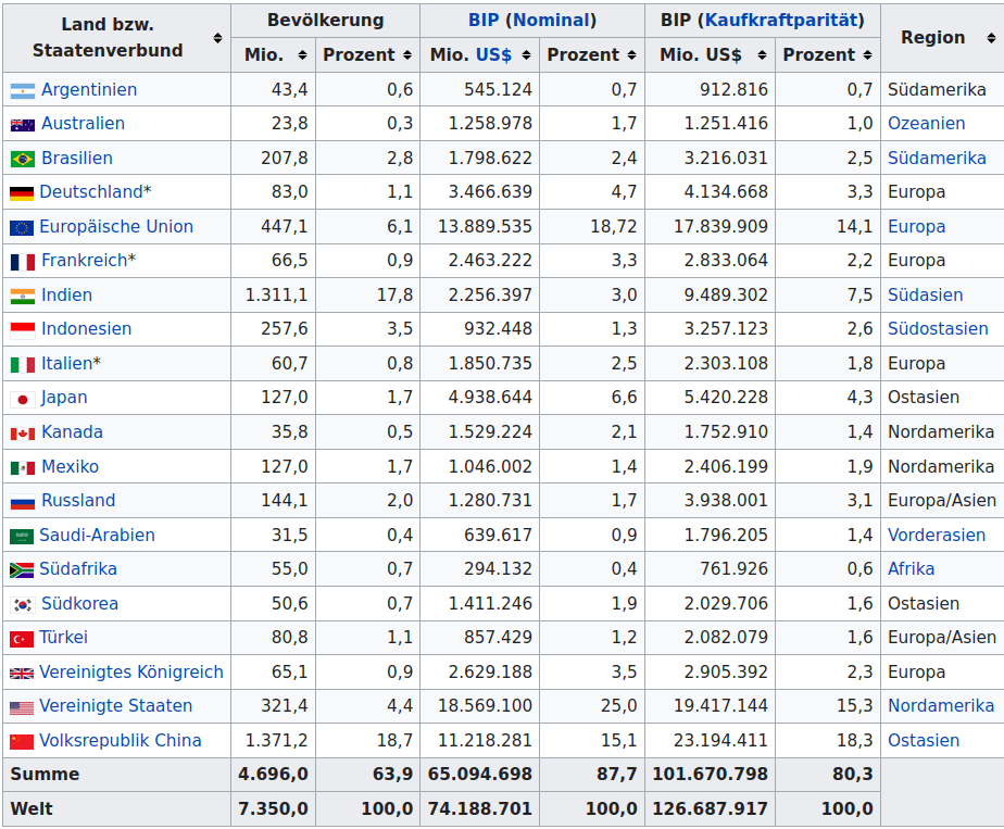 Die 20 von den 200 machen 3/4 der Erdbevölkerung aus, so ungefähr. Das Erste was mir da kommt: Sauinteressant. Das Zwote: Unbehagen. Das Dritte: Wenn schon 3/4, dann warum nicht gar die ganze Erdbevölkerung? Wo bleiben da die Zwerge mit 50 und weniger Millionen ab?