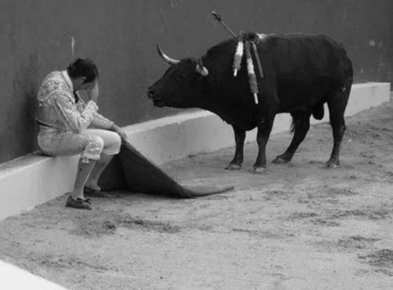Dieses berühmte Foto zeigt das Karriereende von Matador Alvaro Munero. Mitten im Kampf setzte er sich plötzlich reuevoll an den Rand der Arena. Später, in einem Interview, wird Alvaro erzählte er: