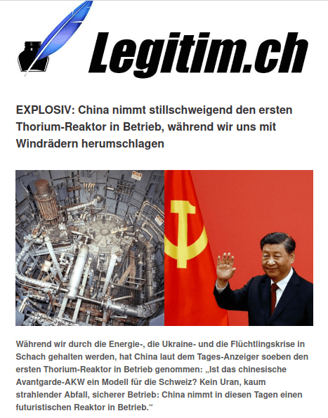 „China hat den erdenweit ersten Thorium-Reaktor in Betrieb genommen, wo man China Gewissenlosigkeit in Sachen „Schutz der Natur“ nachsagt.“