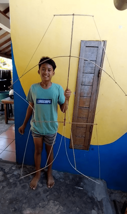 Material: Junger Bambus, leicht dehnbare Schnur (welche beim Mauerbau als Richtschnur verwändet wird), leichter Stoff oder Plastik. That’s it.