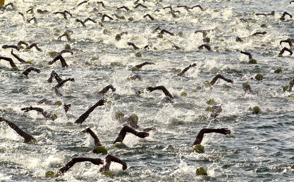 Veröffentlicht in 969 × 600 in Athletes compete during the swimming leg of the Ironman Zurich Switzerland Triathlon in the waters of Lake Zurich.