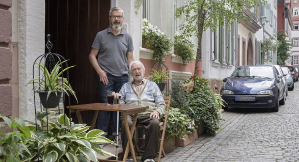 „Kurt Baust wird im August 105 Jahre alt. Er ist der älteste Einwohner Heidelbergs und sitzt seit Jahrzehnten gern vorm Haus in der Pfaffengasse. Das darf er nicht mehr. Auch Sohn Peter (stehend) und der Nachbarschaft ist das Sitzen in der Gasse verboten worden.“