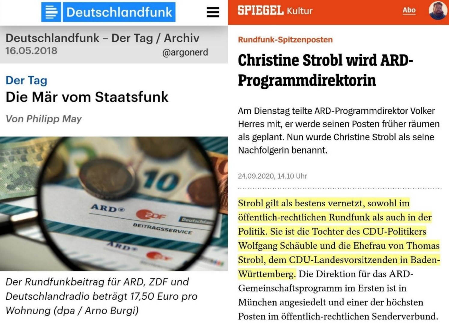 Zuerst die gute Nachricht, Der Programmdirektor der ARD räumt endlich seinen Posten. Es wurde höchste Zeit daß endlich eine Frauenqoutin ohne politischen Migrationshintergrund den Saustall aufräumt. Wer könnte das besser als Christine Strobl, die die lupenreine Schule von Wolfgang Schäuble in Sachen Demokratie und Ehrlichkeit durchmachte. Alles wird jetzt gut bei der ARD. Für die künftige ausgewogene Berichterstattung zahlen wir doch gerne ihr das Jahresgehalt von 395.000 €. gelle.