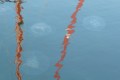 An ihren Füßen hängen Kette mit Mühlstein. Zudem sind sie untereinander eng mit Stricken gefesselt.